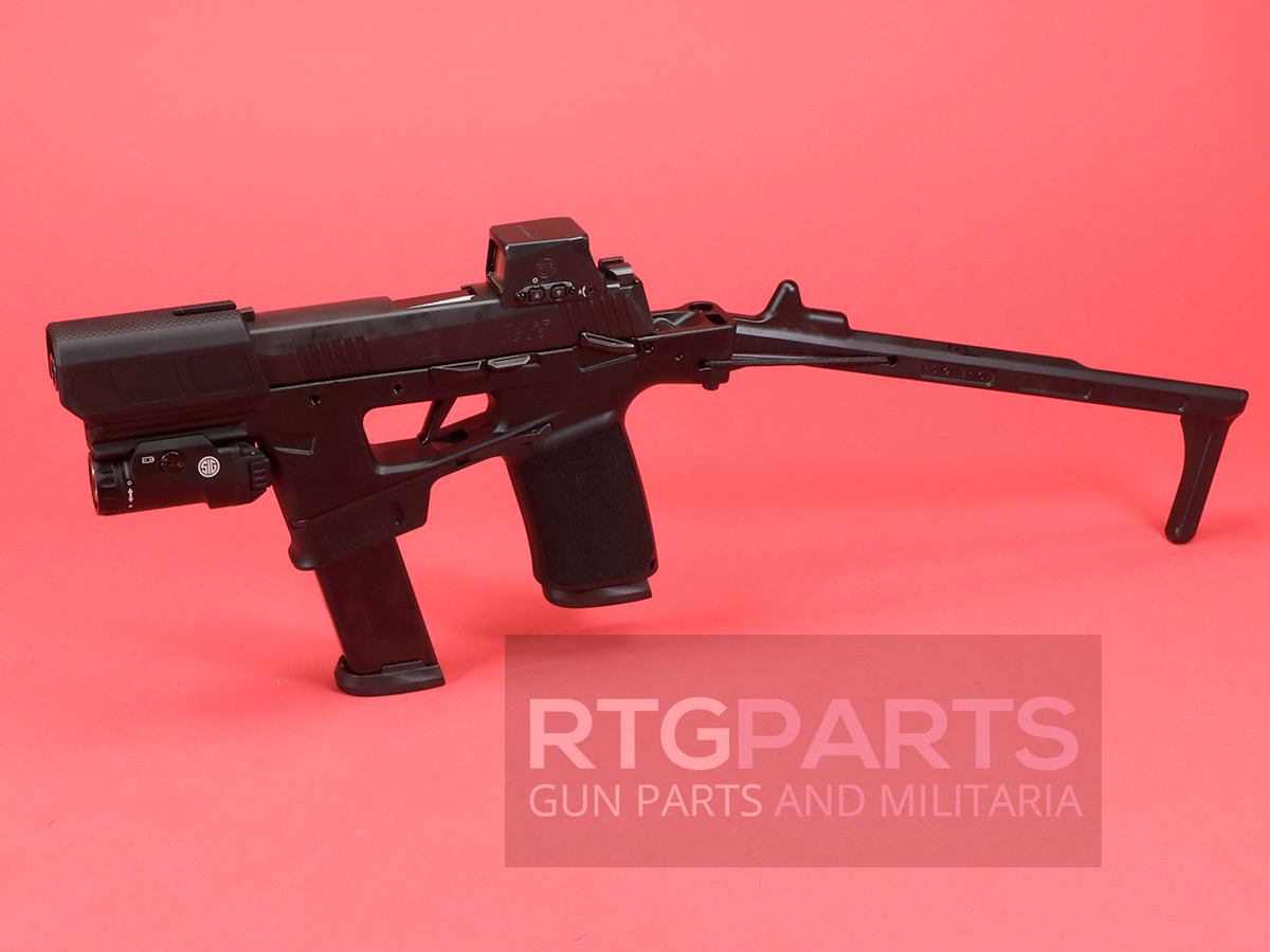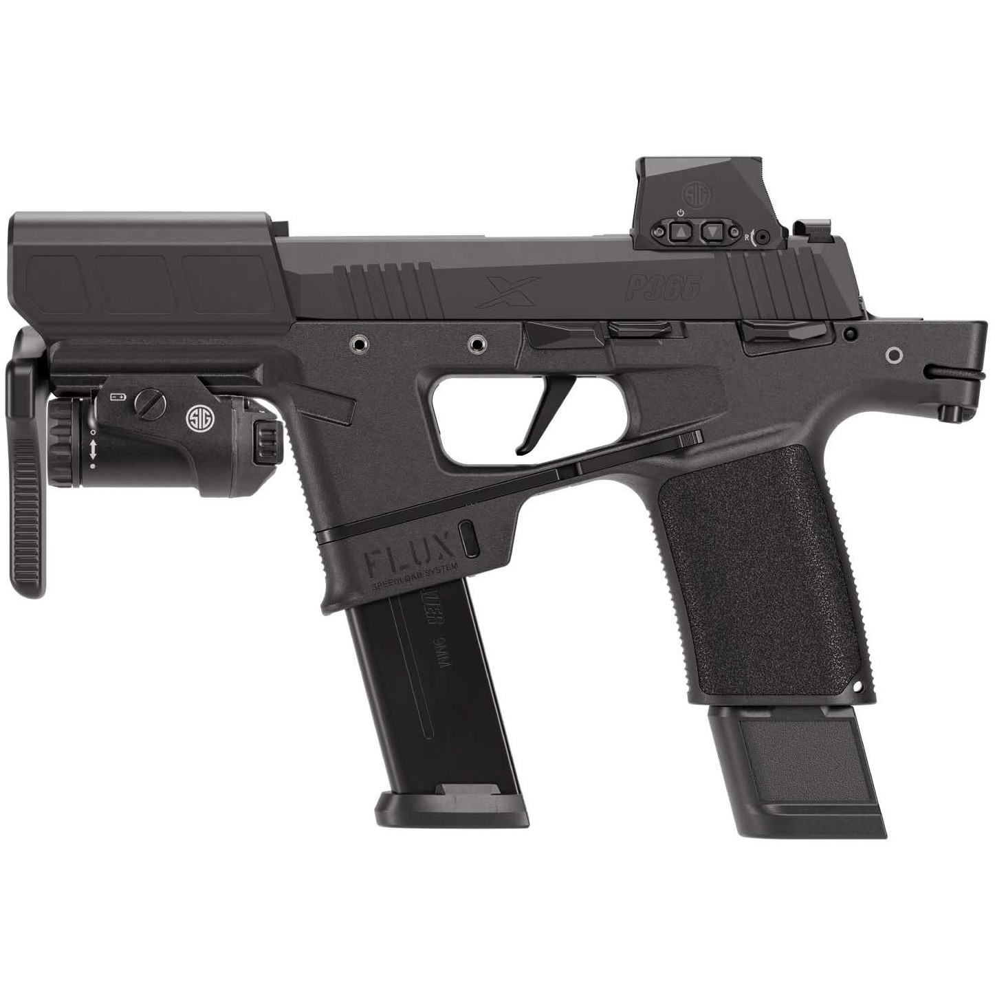The P365 FLUX meshes a 9mm handgun with a PCC style platform, bringing the speed, maneuverability, and concealability of a pistol, combined with the stability of a carbine. The P365-FLUX delivers a host of innovative features and enhancements, including a spring deployable brace for rapid utilization, muzzle shroud, front picatinny mount for a variety of accessories, XRAY3 Day/Night sights, ambidextrous controls, Foxtrot LED light and holster.