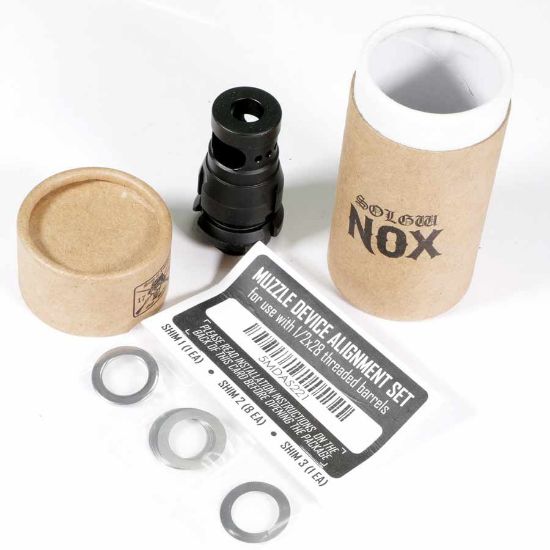 Sons of Liberty Gun Works NOX Muzzle Brake, 556NATO/9MM, Nitride Finish, Black, 1/2X28, Fits Dead Air Armament Suppressors, and KeyMount Accessories, Single Chamber, Includes Timing Shims