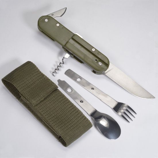 Knife and eating utensil combo tool for your pack or camper. Stainless steel utensils and sharp blade with nylon case. Brand new.Includes knife, can and bottle opener, cork screw, spoon & fork with screwdriver.