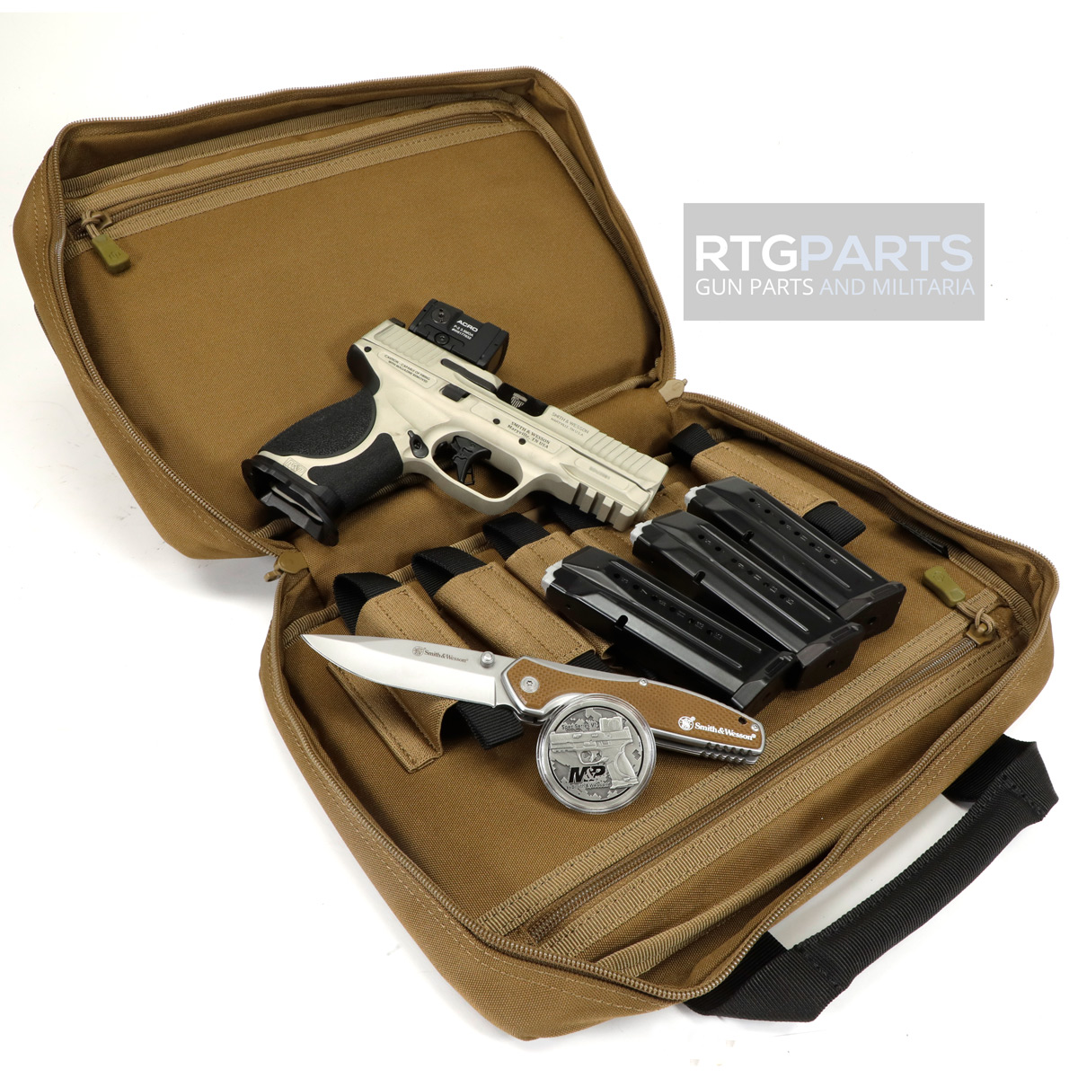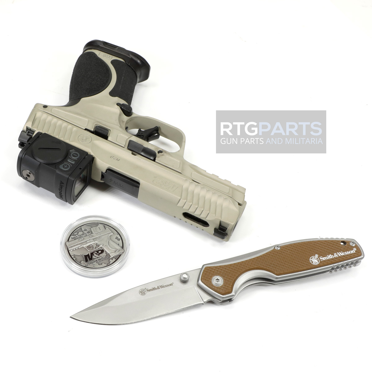 Smith & Wesson, M&P M2.0 Metal Compact, Spec Series VI, Semi-automatic, Striker Fired, Aluminum Frame Pistol, Compact, 9MM, 4" Barrel, Cerakote Finish, Champagne, Aimpoint ACRO P-2 Optic, Inline Ported Slide, Floyds Custom Shop EDC Magwell and Baseplates, Adjustable Sights, 15 Rounds, 3 Magazines, Includes Savior Pistol Bag, Hunter Constantine Carry Belt, Spec Series VI Knife & Spec Series Patch