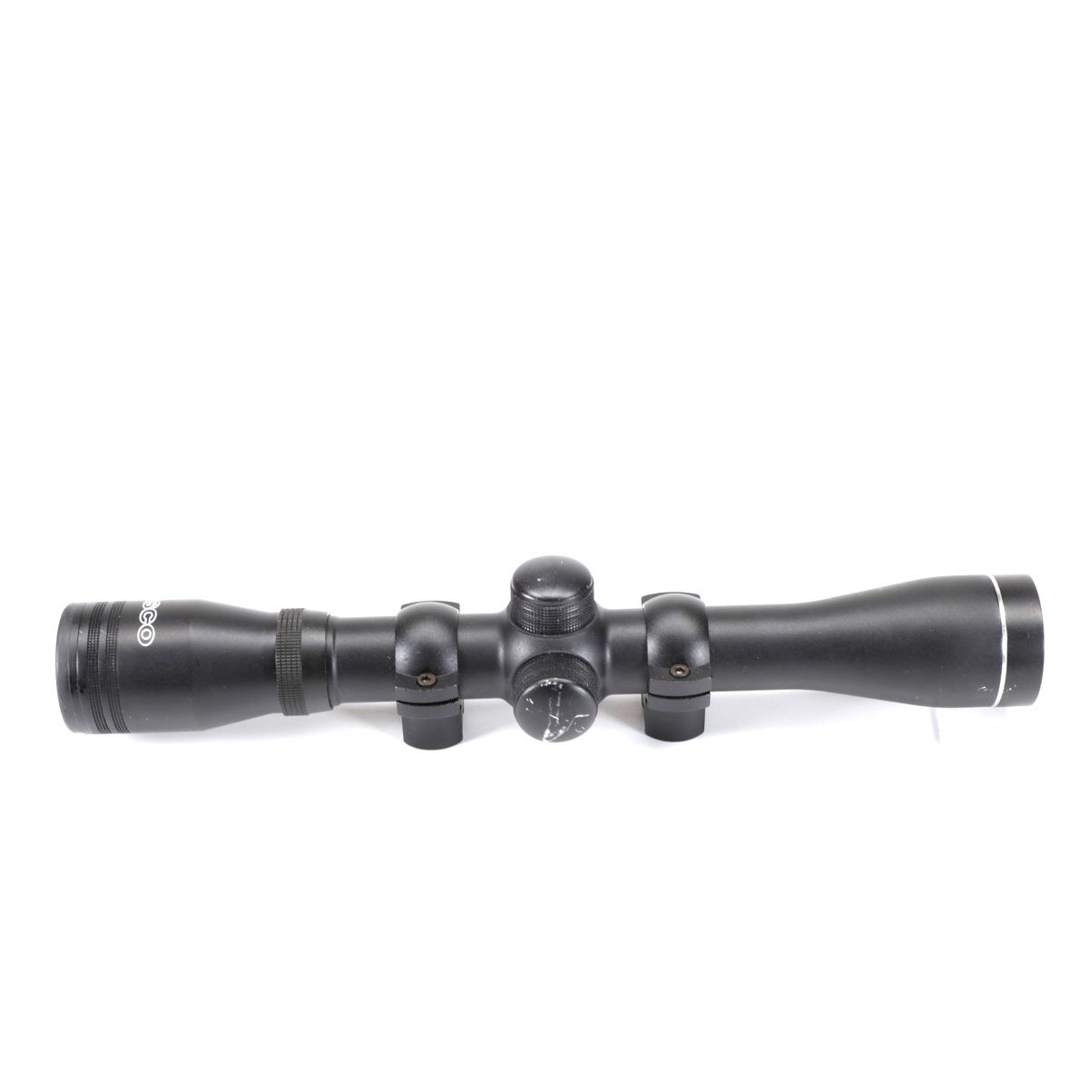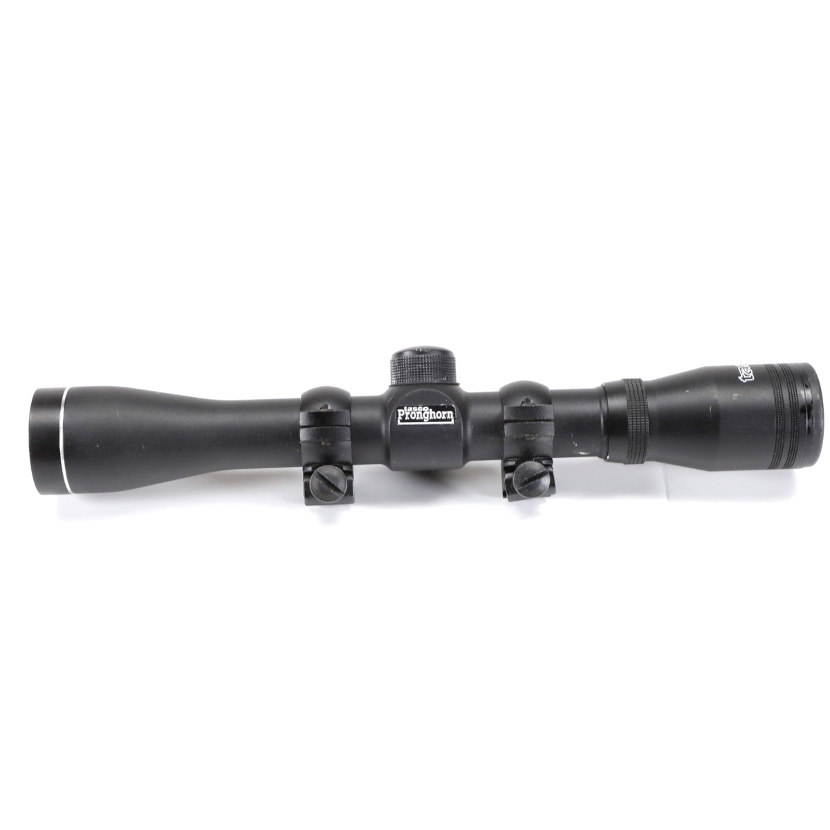 TASCO PRONGHORN RIMFIRE SCOPE WITH RINGS. Rings are for mounting to a 3/8" dovetail like found on many rimfire rifles. Optics appear clear.