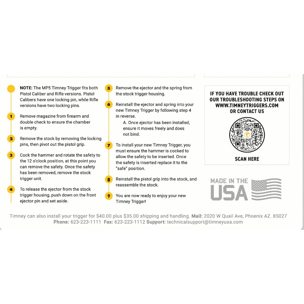 The Timney replacement Two-Stage Trigger for HK MP5 Semi-Automatic Variants utilizes your existing rifle's ejector lever, ejector spring, and the ejector axis pin that are matched to your rifle's chambering.