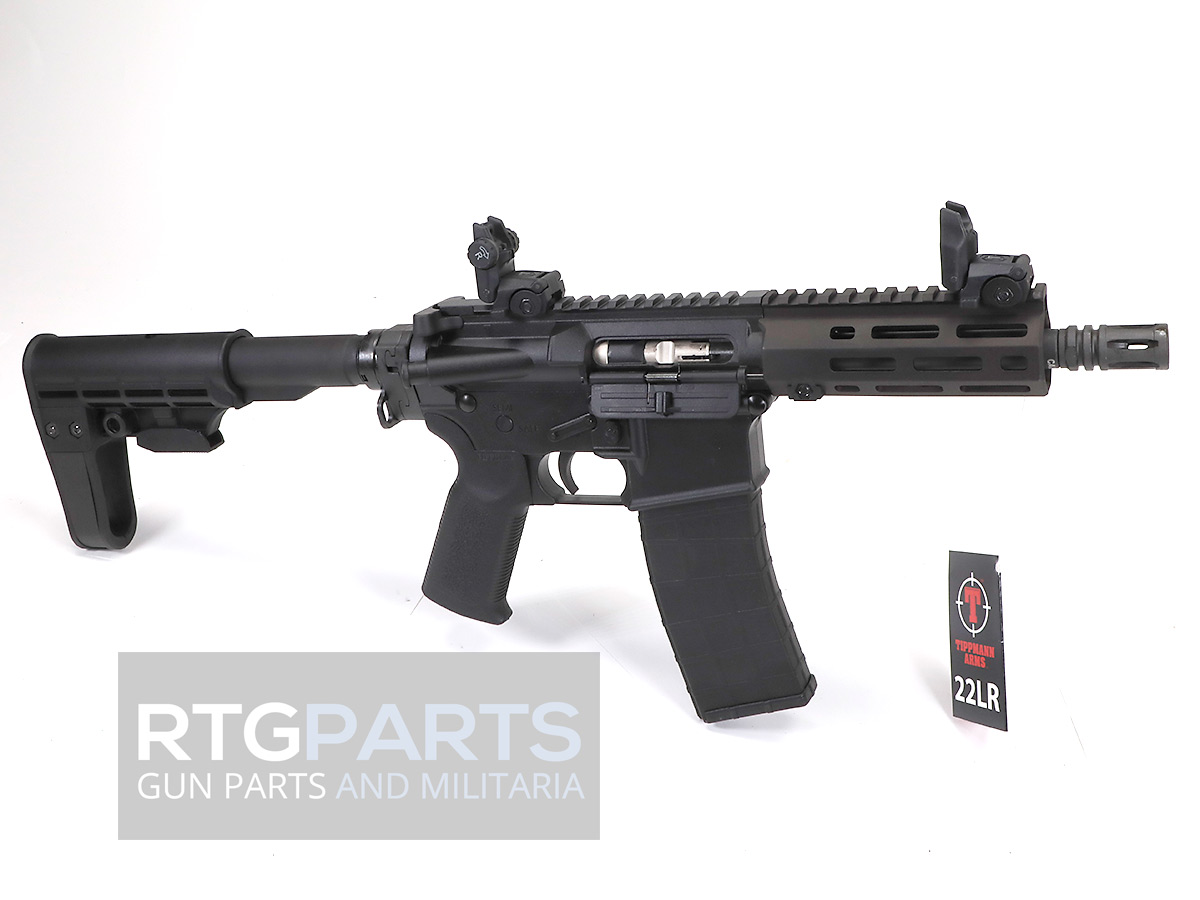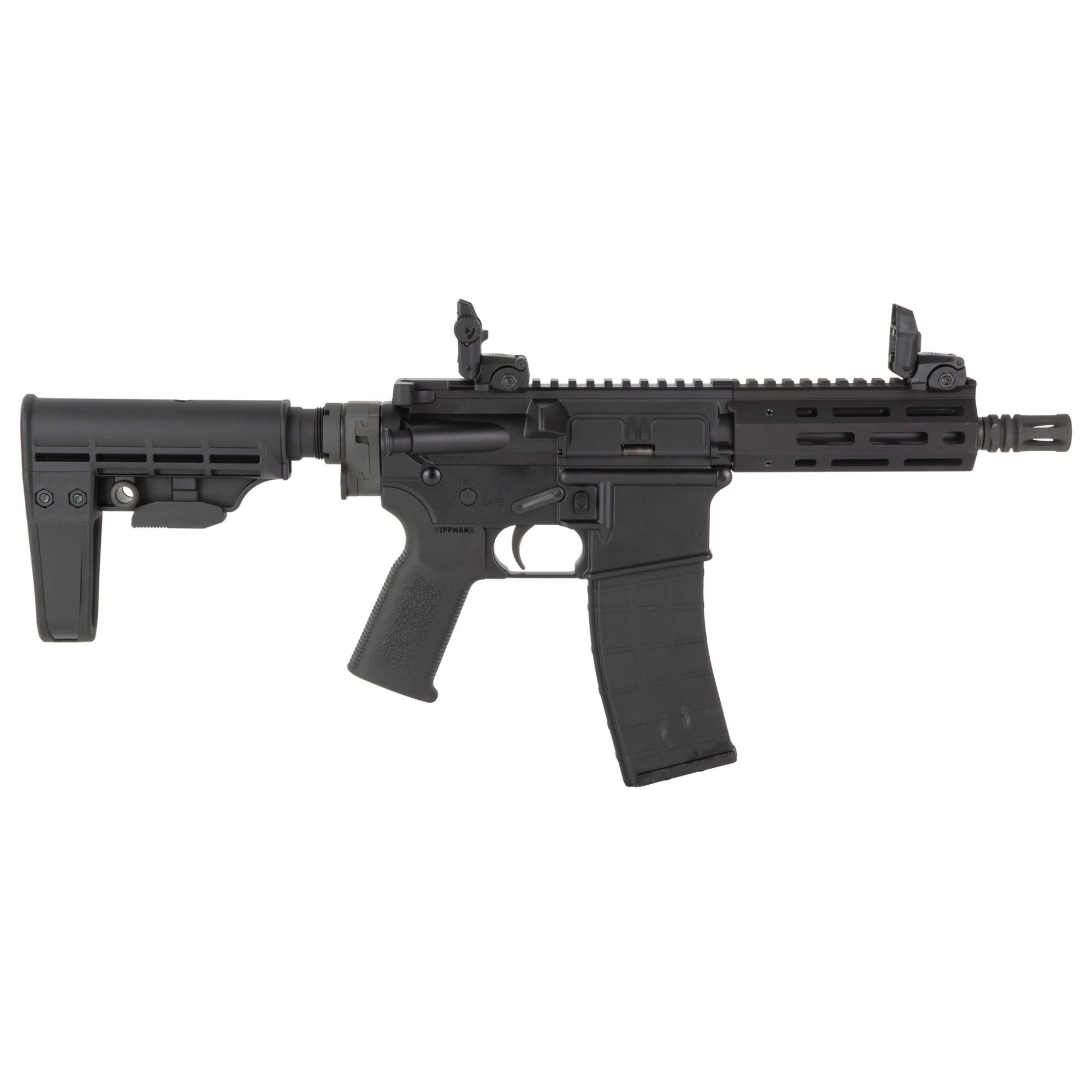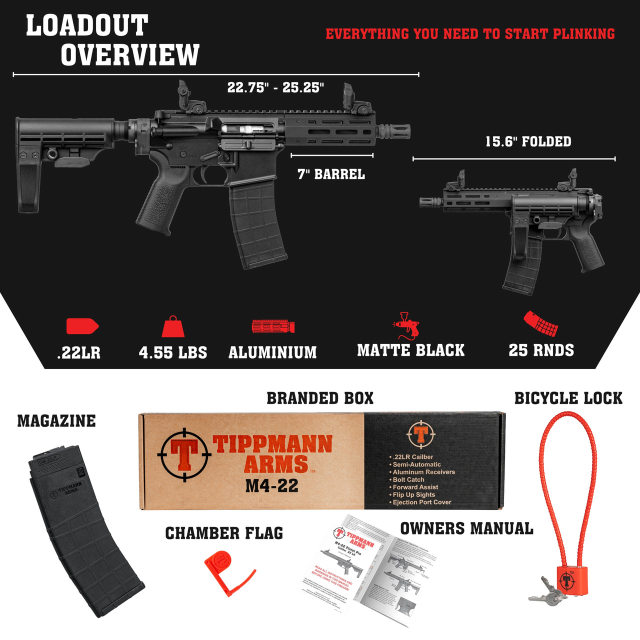 Tippmann Arms Company, M4-22, Micro Elite BUG OUT Pistol, Semi-Automatic Pistol, AR, 22 LR, 7" Threaded Barrel, 1/2X28 Thread Pitch, Aluminum MLOK Handguard, Matte Finish, Black, Folding T5 Pistol Brace, Front/Rear Flip Sights, 1 Magazine, 25 Rounds