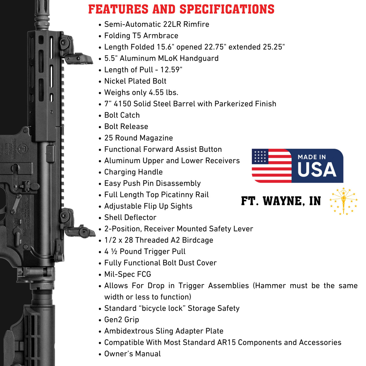 The Micro Elite Bug Out Pistol is a premium .22 caliber semi-automatic AR styled pistol with aluminum upper and lower receivers and all the features of a true M4 pistol. The Micro Elite Pistol features a folding T5 Armbrace, 7" barrel, 5.5" aluminum MLOK handguard and weighs only 4.55 lbs.