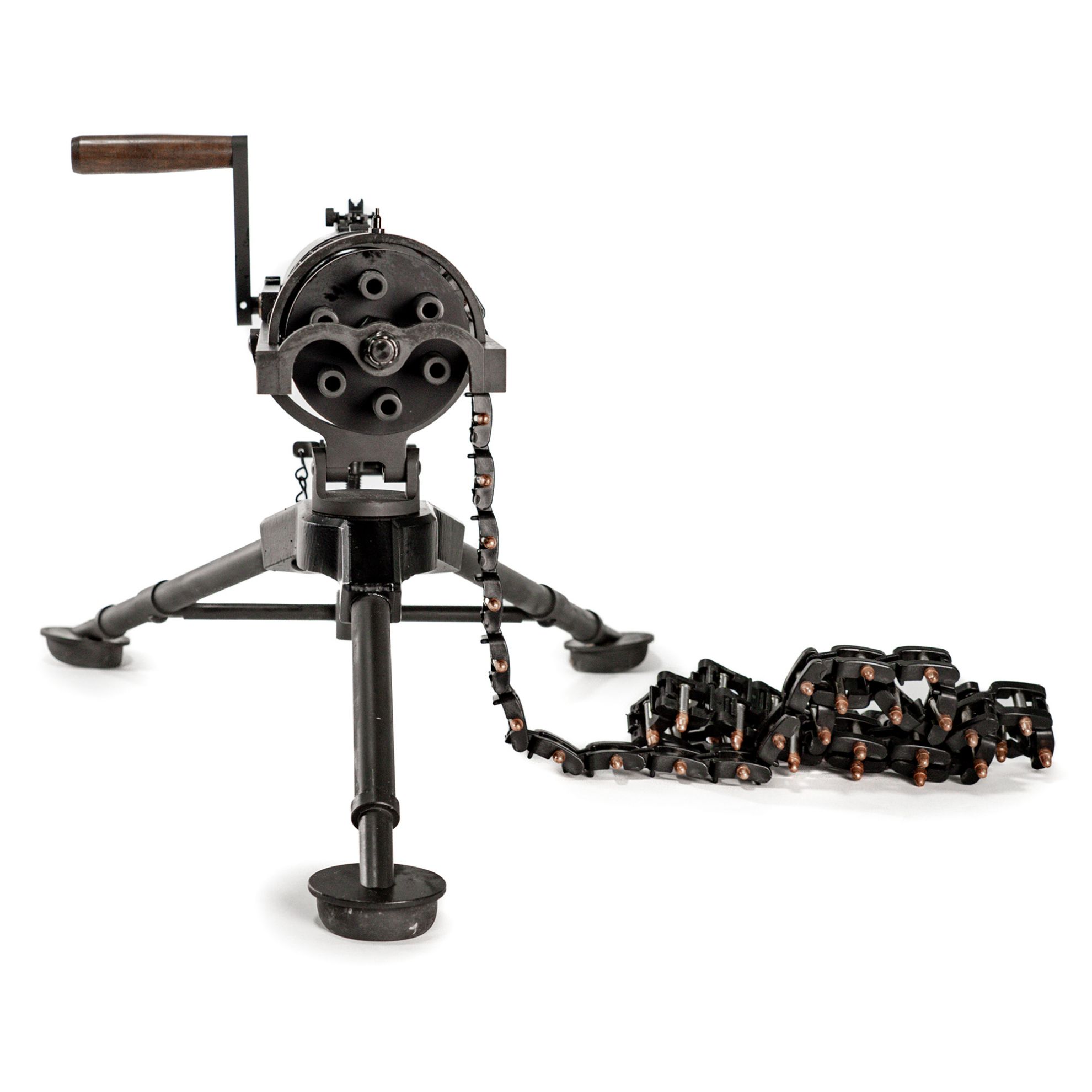 The .22LR Gatling Gun includes a 50-round belt with a snap-in system for easy loading and unloading. Belts can be made as short or as long as you desire. Hand Crank action enables rapid-fire capability for a thrilling shooting experience.
