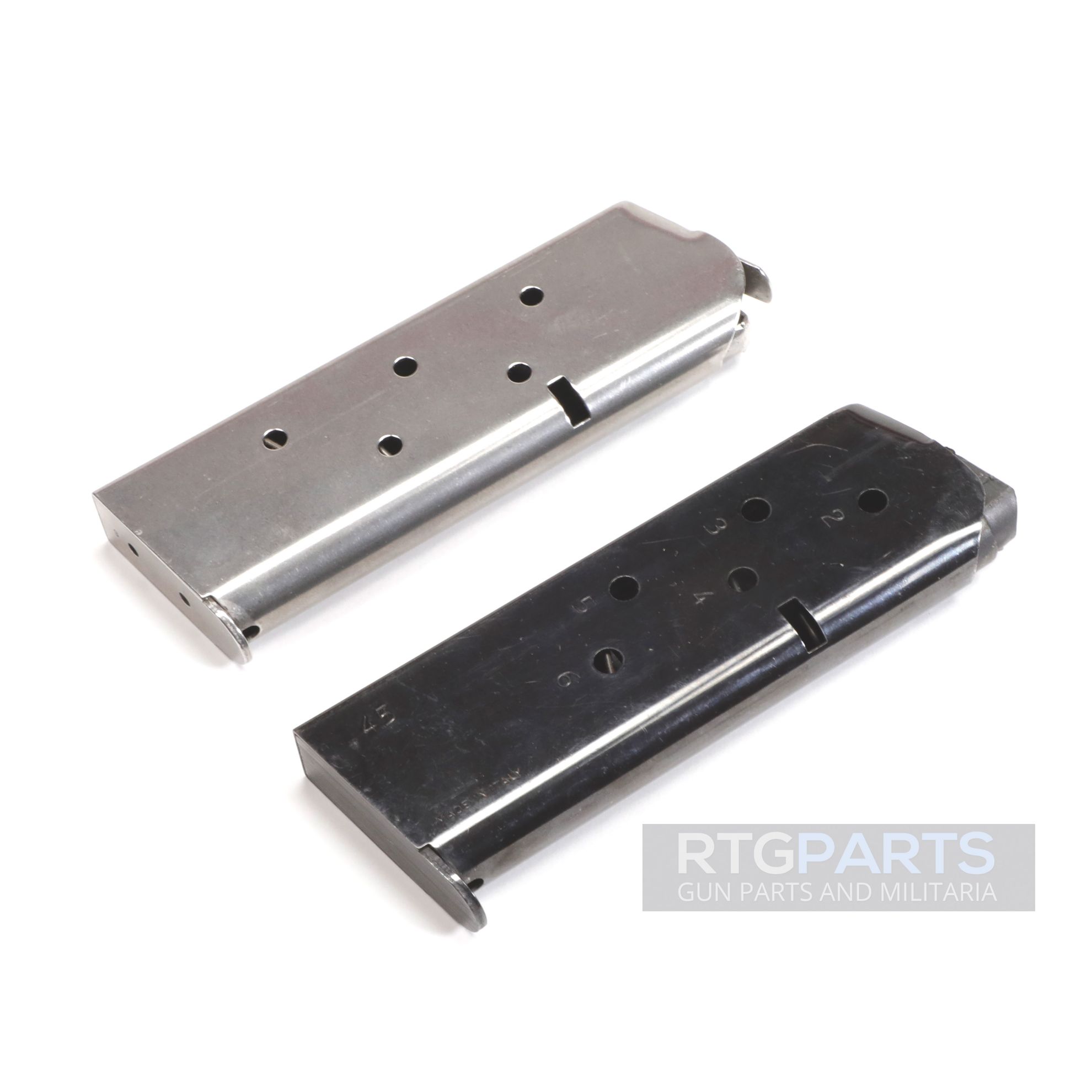 TWO 1911 OFFICERS MODEL MAGS. The stainless mag is in excellent condition, very high quality with an S on the bottom. The black mag is Mec-Gar who alwasy makes great mags, but this one has a non standard follower that I have never seen before. Not sure what it was used for.