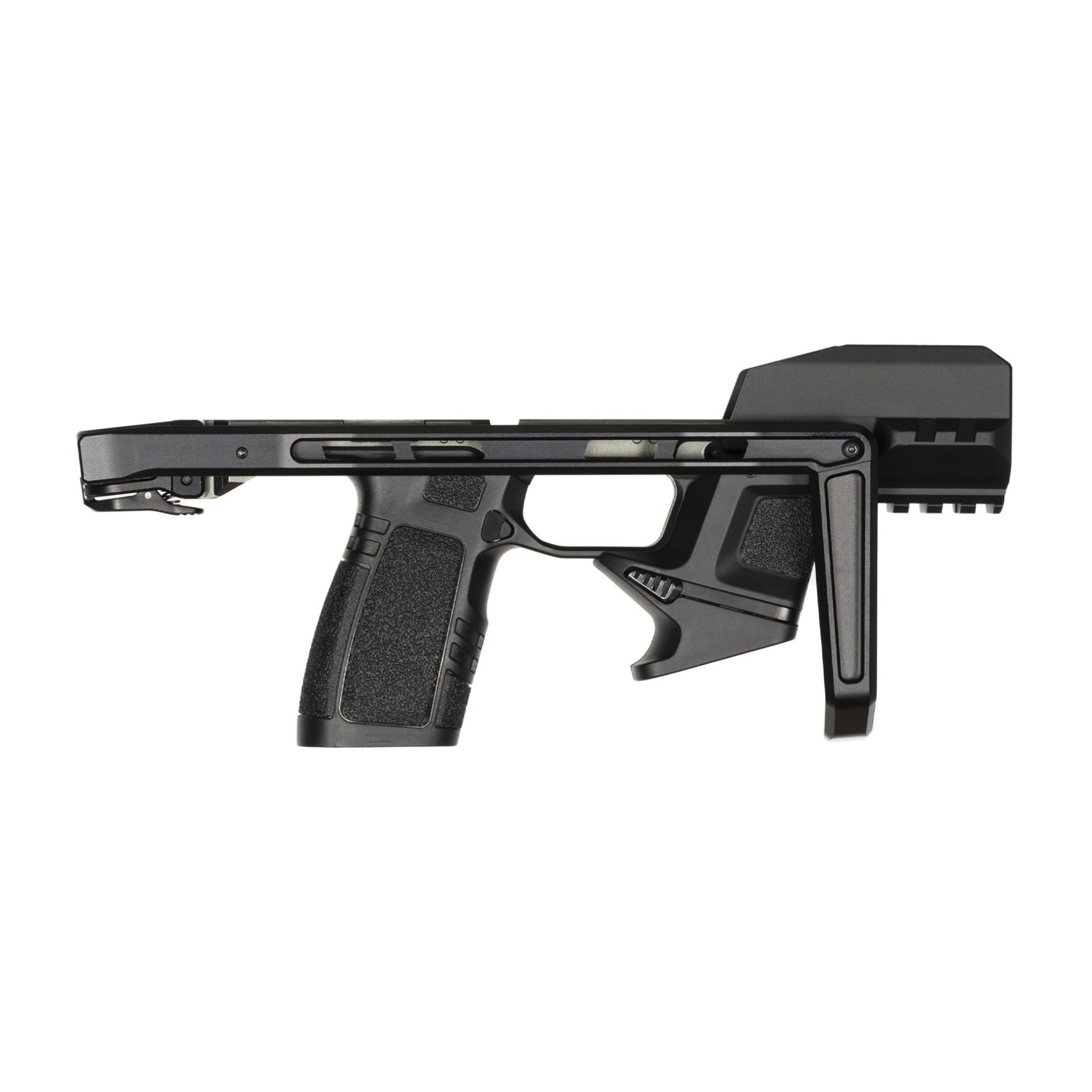 - Includes Aluminum Spring Loaded Pistol Brace, Aluminum Receiver/Blast Shield and Injection Molded Pistol Grip and Magazine Carrier