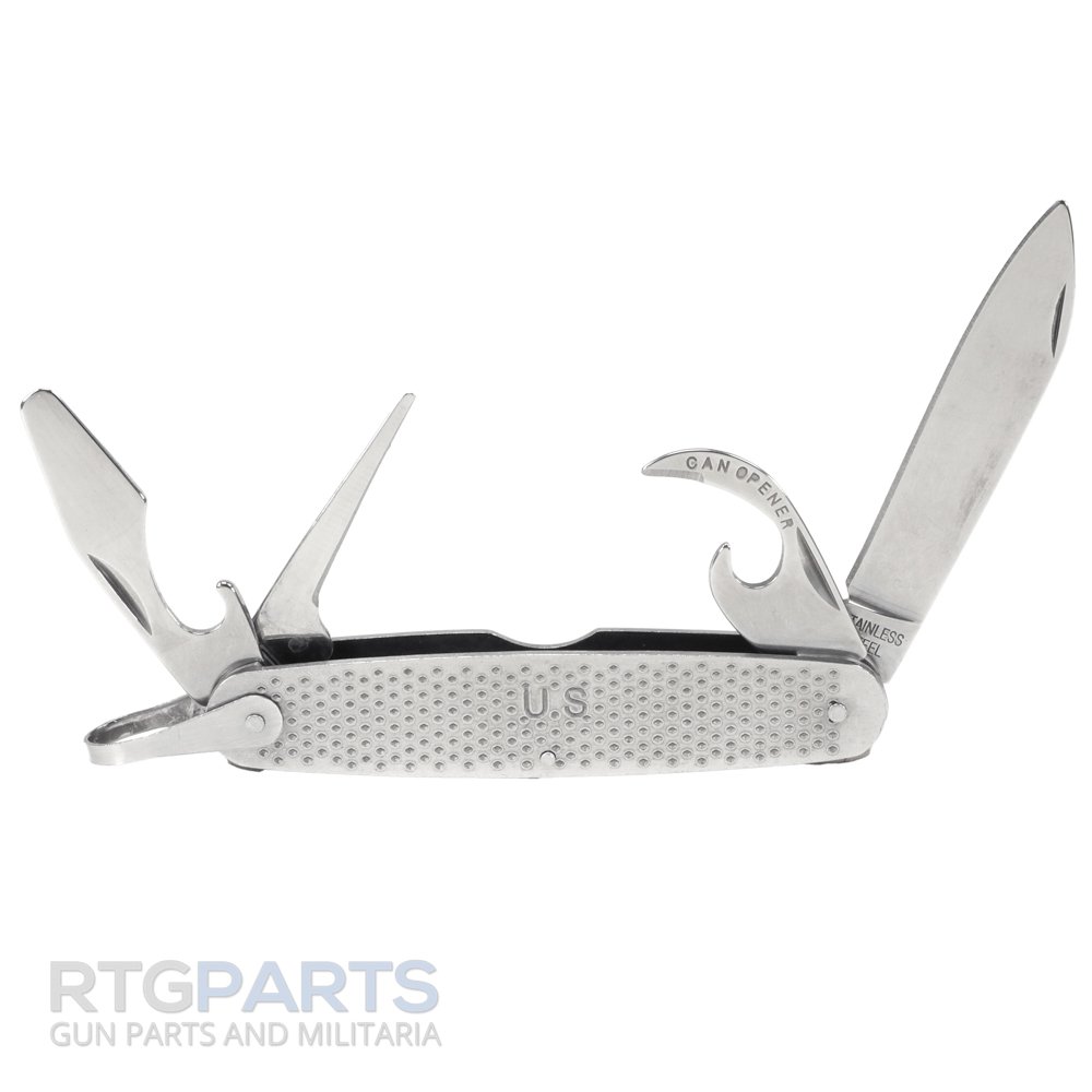 US Army Style, stainless steel, multi function pocket knife. Faithful reproduction of the original USGI multi function knife. These are brand new and new production.