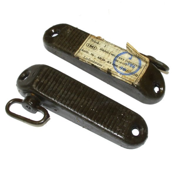 Original IMI production buttplate assembly for uzi wood stock. These are still new in the cosmoline (as shown in pictures) and most still have the stock label attached directly to the part.
