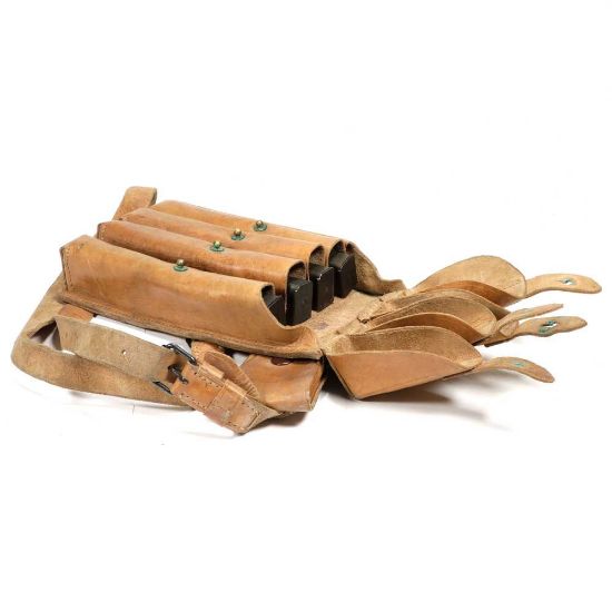 Yugo M56 SMG 4-Cell, leather magazine pouch with leather strap and small leather tool pouch. Works great for not only M56 mags, but similar sized mags like PPSh-41, M49/57